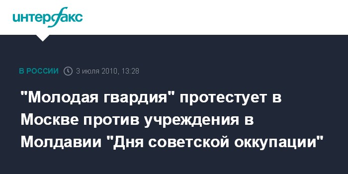Москва. 3 июля. INTERFAX.RU - Представители движения "Молодая гвардия Единой России" проводят в субботу в центре Москвы серию акций с критикой руководства Молдавии, объявившего 28 июня "Днем советской оккупации".