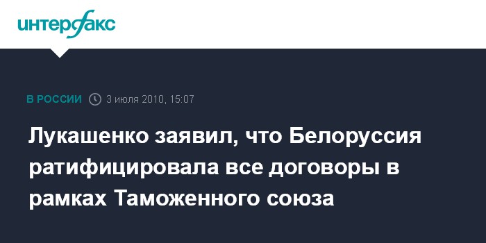 Москва. 3 июля. INTERFAX.RU - Белоруссия к настоящему времени ратифицировала все договоры и соглашения в рамках Таможенного союза, включая Таможенный кодекс, заявил президент Александр Лукашенко журналистам в субботу в Минске.