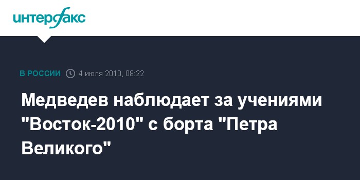 Владивосток. 4 июля. ИНТЕРФАКС - Президент России Дмитрий Медведев вышел в Охотское море на крейсере "Петр Великий" и следит за морской фазой учения "Восток-2010" с ходового командного поста корабля.
