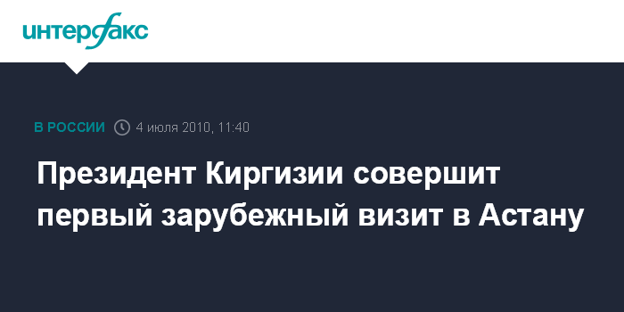 Бишкек. 4 июля. INTERFAX.RU - Президент Киргизии Роза Отунбаева в воскресение днем вылетит в Астану, где 5 июля примет участие в заседании глав государств ЕврАзЭС, сообщил "Интерфаксу" руководитель информационно-координационного центра аппарата временного правительства Фарид Ниязов. "Это первый зарубежный визит Р.Отунбаевой после избрания ее президентом Киргизии", - отметил собеседник агентства.