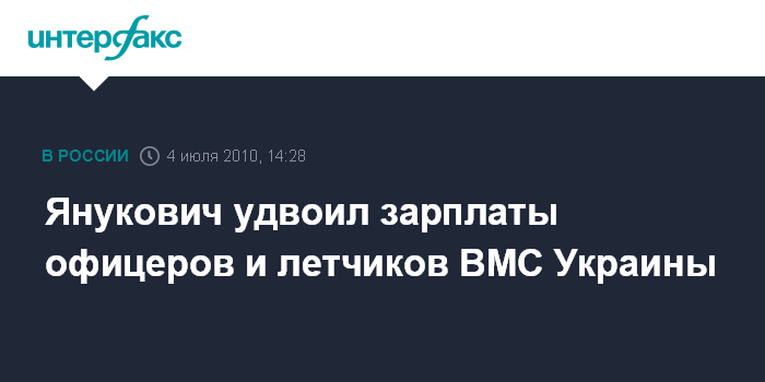 Киев. 4 июля. INTERFAX.RU - Заработная плата офицеров и военных летчиков Военно-морских сил Украины будет повышена с 1 октября в два раза, заявил президент Украины Виктор Янукович во время празднования Дня флота Украины в Севастополе в воскресенье. "Наша задача - создание сильного флота, готового адекватно реагировать на современные вызовы и угрозы. Мы должны возродить славу Украины как сильного морского государства", - сказал В.Янукович, выступая на борту флагмана ВМС Украины фрегата "Гетман Сагайдачный", сообщает пресс-служба главы государства.
