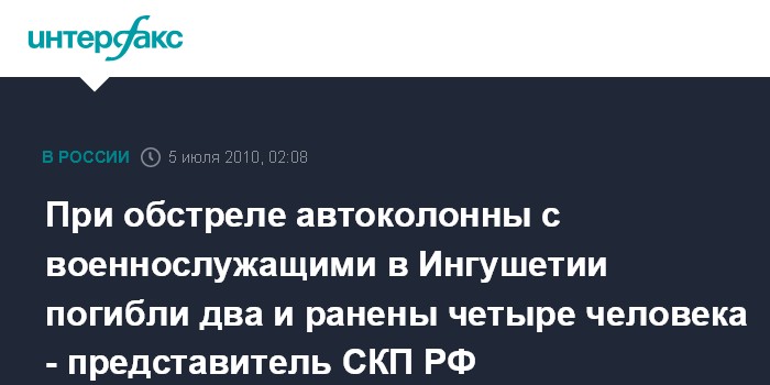 Назрань. 5 июля. ИНТЕРФАКС-ЮГ - В результате обстрела автоколонны с военнослужащими в Назрановском районе Ингушетии, по уточненным данным, погибли два военнослужащих, а четверо получили ранения.