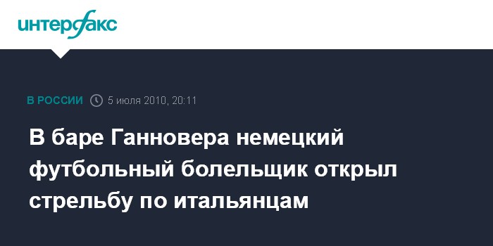 Берлин. 5 июля. INTERFAX.RU - В немецком городе Ганновере неизвестный открыл стрельбу в баре из-за ссоры по поводу футбола, один человек погиб сообщает в понедельник Интернет-сайт немецкого журнала Welt.