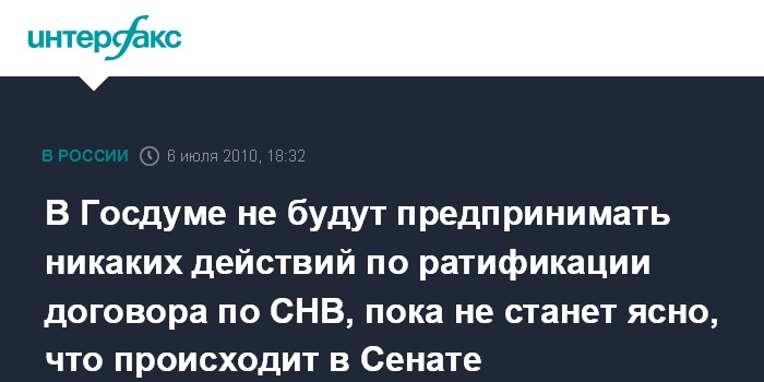 "Мы не будем спешить с ратификацией договора до тех пор, пока не будем лучше представлять себе, каковы же перспективы того, что наши американские коллеги сделают то же самое", - сказал он в эфире Russia Today.