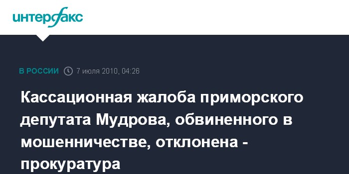 Кассационная жалоба приморского депутата Мудрова, обвиненного в мошенничестве, отклонена - прокуратура