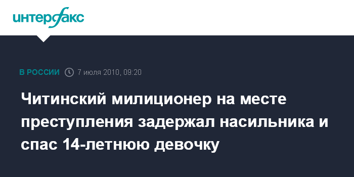 Москва. 7 июля. INTERFAX.RU - Сержант читинской милиции Артем Зайков задержал насильника и спас его жертву, 14-летнюю девушку, которую тот хотел утопить.