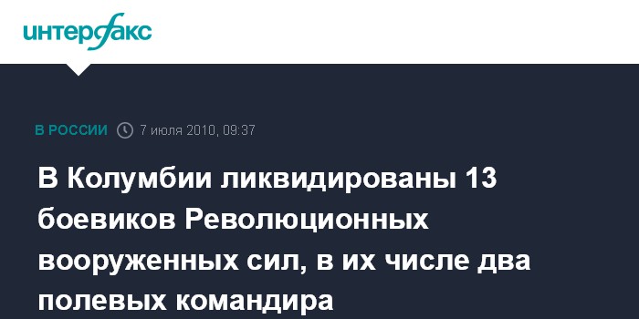Москва. 7 июля. INTERFAX.RU - Не менее 13 боевиков левацкой группировки Революционные вооруженные силы Колумбии (РВСК) погибли в ходе удара, нанесенного колумбийскими ВВС по району Монтес-де-Мариа в провинции Боливар на Карибском побережье Колумбии, передает в среду британская телерадиокорпорация ВВС.