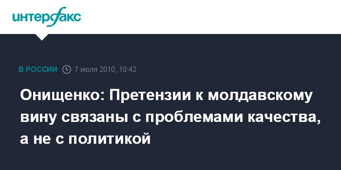 "Правительство Молдавии, как нам представляется, не следит за ведущей отраслью своей экономики. Мы браковали партии молдавских виноматериалов, теперь мы не выдаем видовое разрешение. Это оговорит о том, что что-то там неблагополучно", - сказал на прошлой неделе Г.Онищенко "Интерфаксу".