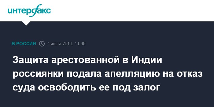 "После отказа судьи, ведущего дело, выпустить под залог россиянку, в среду мы подали апелляцию в вышестоящую инстанцию - окружной суд Рупнагара", - сообщил "Интерфаксу" адвокат О.Тимошик Бириндер Сингх.