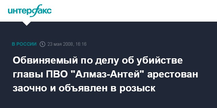 Обвиняемый по делу об убийстве главы ПВО "Алмаз-Антей" арестован заочно и объявлен в розыск