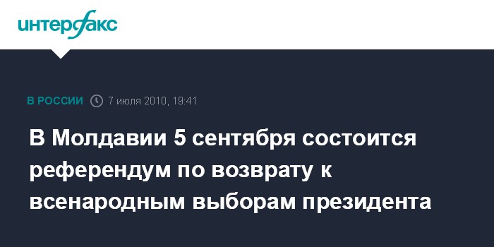Кишинев. 7 июля. INTERFAX.RU - Парламент Молдавии принял в среду постановление о проведении 5 сентября 2010 года конституционного референдума по вопросу о возвращении к всенародным выборам президента.