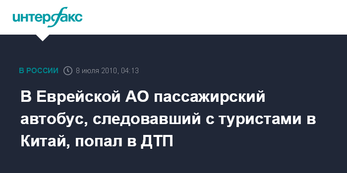 Хабаровск. 8 июля. ИНТЕРФАКС - ДАЛЬНИЙ ВОСТОК - На 32 километре автодороги Биробиджан - Ленинское (Еврейская автономная область, ЕАО) автобус с туристами, ехавшими в Китай, съехал в кювет, пострадавших нет. Как сообщила агентству "Интерфакс - Дальний Восток" представитель пресс-службы Дальневосточного регионального центра (ДВРЦ) МЧС Екатерина Потворова, ДТП произошло в четверг утром.