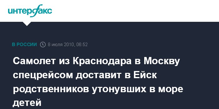 Ростов-на-Дону. 8 июля. ИНТЕРФАКС-ЮГ - По распоряжению губернатора Краснодарского края Александра Ткачева в Москву направлен самолет за родственниками и родителями московских школьников, утонувших во время купания в Азовском море под Ейском, сообщили агентству "Интерфакс-Юг" в транспортных структурах региона.