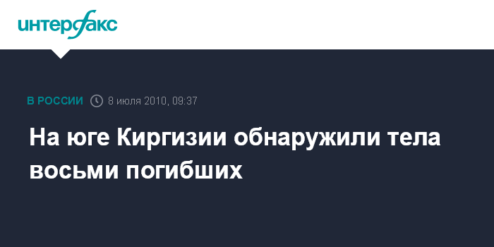 Москва. 8 июля. INTERFAX.RU - В прилегающем к городу Ош селе Шарк обнаружено восемь неопознанных трупов, сообщили "Интерфаксу" в пресс-службе комендатуры южной столицы Киргизии.
