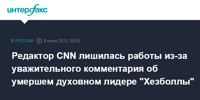 Москва. 8 июля. INTERFAX.RU - Ближневосточный редактор американского телеканала CNN Октавиа Наср уволена после того, как на сайте социальной сети "Твиттер" уважительно отозвалась о скончавшемся недавно ливанском аятолле Мухаммеде Хусейне Фадлалле, передает в четверг британская телерадиокорпорация BBC.