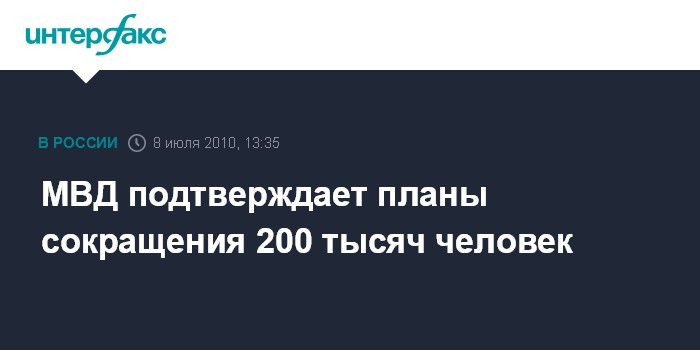 Москва. 8 июля. INTERFAX.RU – Заместитель министра внутренних дел России Сергей Герасимов сообщил, что в рамках реформы МВД сократить численность личного состава министерства на 20%, или более чем на 200 тысяч, а центральный аппарат - на 10 тысяч человек.
