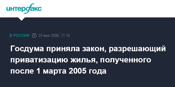 Москва. 23 мая. INTERFAX.RU - Госдума на пленарном заседании в пятницу приняла во втором и третьем чтениях поправки в закон "О приватизации жилищного фонда в РФ", касающиеся порядка приватизации жилья, полученного после 1 марта 2005 года.