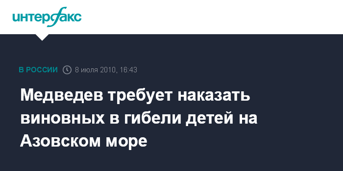 Тверь. 8 июля. INTERFAX.RU - Виновные в гибели детей из оздоровительного лагеря в Краснодарском крае должны понести наказание, заявил президент РФ Дмитрий Медведев.