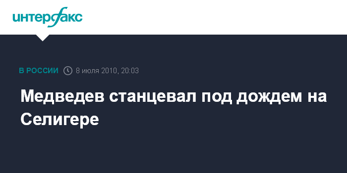 Селигер. 8 июля. INTERFAX.RU - Президент РФ Дмитрий Медведев во время посещения Всероссийского образовательного форума "Селигер-2010" станцевал под дождем вместе с активистами движени "Артпарад".