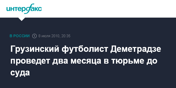 Тбилиси. 8 июля. INTERFAX.RU - Городской суд Тбилиси избрал мерой пресечения известному грузинскому футболисту Георгию Деметрадзе двухмесячное предварительное заключение.