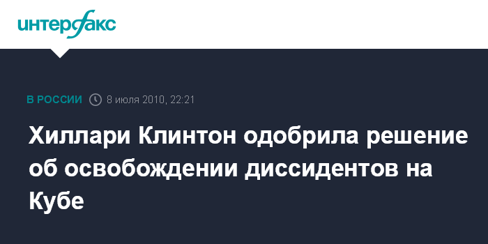 "Мы считаем это позитивным знаком. Этот шаг запоздалый, но все равно желанный", - сказала Х. Клинтон, не указав, однако, скажется ли освобождение диссидентов на отношениях между США и Кубой.