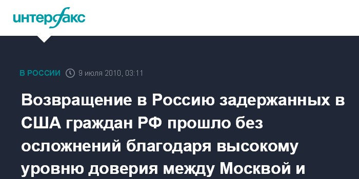 Москва. 9 июля. ИНТЕРФАКС - Возвращение на родину граждан России, задержанных или доставленных в США, удалось организовать быстро, технологично и без осложнений, сообщил СМИ высокопоставленный источник в администрации президента РФ.