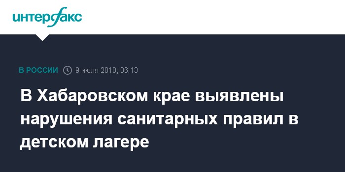 Хабаровск. 9 июля. ИНТЕРФАКС-ДАЛЬНИЙ ВОСТОК - Прокуратура Хабаровского края со специалистами Роспотребнадзора и сотрудниками УВД выявили нарушения санитарных норм и правил в ходе проверки одного из детских летних лагерей.