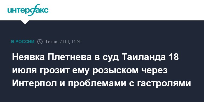 Неявка Плетнева в суд Таиланда 18 июля грозит ему розыском через Интерпол и проблемами с гастролями