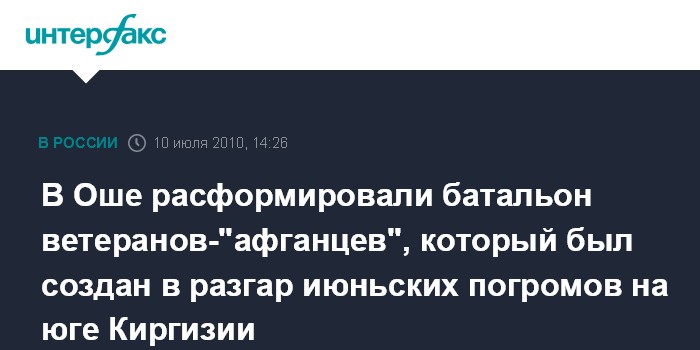 Москва. 10 июля. INTERFAX.RU - В субботу утром в Оше прошла церемония расформирования и прощания с мотострелковым батальоном, созданного 13-14 июня во время трагических событий на юге Киргизии.