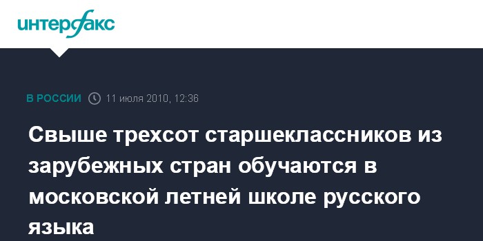 Москва. 11 июля. INTERFAX.RU - Международная летняя школа русского языка для учеников из стран СНГ, Балтии и государств дальнего зарубежья, организованная московскими властями, начала работу в подмосковном пансионате "Московия", сообщили "Интерфаксу" в департаменте образования столицы. "В этом году летняя школа русского языка в восьмой раз открывает двери для более чем 300 учеников в возрасте до 16 лет", - отметили в департаменте. Собеседник агентства рассказал, что в этом году в школу приехали делегации из 36 стран.
