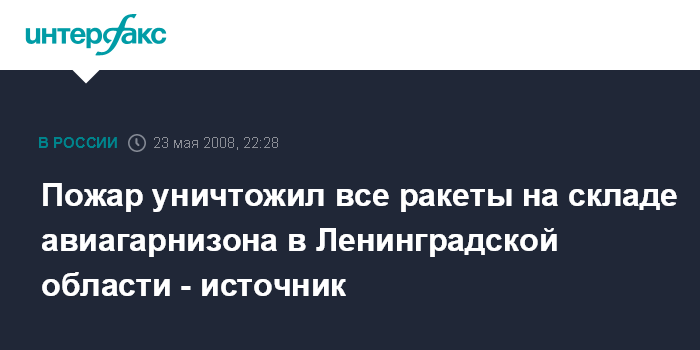 Москва. 23 мая. ИНТЕРФАКС-АВН - Все 450 ракет "воздух - воздух", хранившихся на складе авиационного вооружения авиагарнизона "Лодейное поле" в Ленинградской области, уничтожены в результате пожара, сказал "Интерфаксу-АВН" в пятницу вечером источник в штабе 6-й армии ВВС и ПВО, которой принадлежит склад.