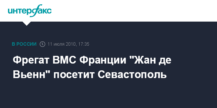 Севастополь. 11 июля. INTERFAX.RU - Фрегат Военно-морских сил Вооруженных сил Франции "Жан де Вьенн" 13-16 июля будет находиться в Севастополе с визитом. Как сообщили агентству "Интерфакс-Украина" в пресс-службе Севастопольской городской государственной администрации, 14 июля французские моряки возложат цветы у Мемориала героическим защитникам Севастополя 1941-1942 годов и на французском мемориальном кладбище. А 15 июля с 14.00 до 17.00 корабль будет открыт для посещения жителями Севастополя.