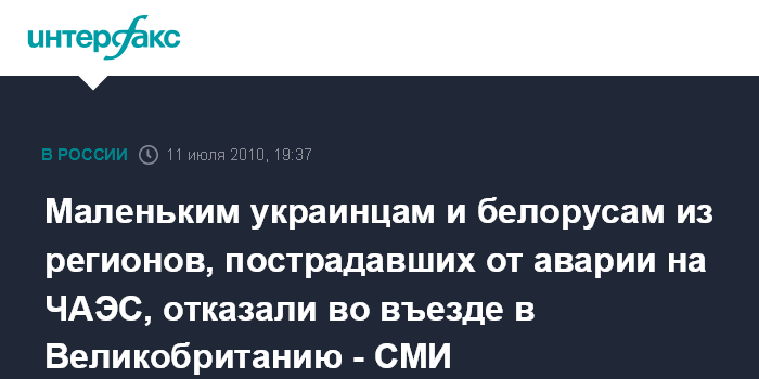 Киев. 11 июля. ИНТЕРФАКС-УКРАИНА - Пограничное агентство Министерства внутренних дел Великобритании отказало в выдаче виз детям из Белоруссии и Украины, проживающих в регионах, пострадавших от аварии на ЧАЭС, сообщает в воскресенье газета Independent.