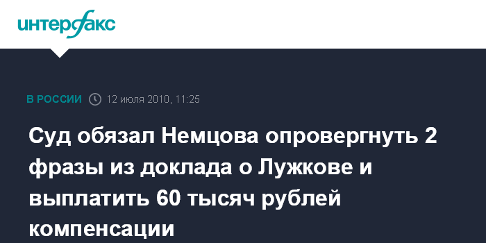 Москва. 12 июля. INTERFAX.RU - Девятый арбитражный апелляционный суд в понедельник обязал политика Бориса Немцова опровергнуть две фразы из доклада "Лужков. Итоги" и выплатить 60 тыс. рублей компенсации морального вреда.