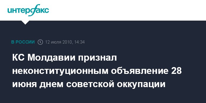 Москва. 12 июля. INTERFAX.RU - Конституционный суд Молдавии в понедельник признал неконституционным указ исполняющего обязанности президента Михая Гимпу, который постановил отмечать 28 июня как день советской оккупации. В решении конституционного суда говорится, что указ признан незаконным по той причине, что исполняющий обязанности президента попытался дать юридическую и правовую оценку историческим событиям.