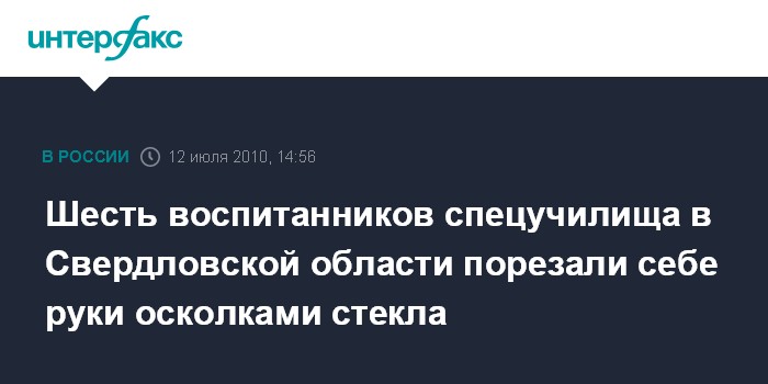 Установлено, что около 6:00 часов утра в понедельник в Рефтинском специальном профессиональном училище закрытого типа N1 старший дежурный по режиму обнаружила, что шестеро воспитанников в возрасте от 15 до 18 лет пьют водку в общежитии отряда N2, и вызвала милицию. "Протестуя против прибытия милиционеров, воспитанники разбили стекла в дверях и их обломками нанесли себе порезы на руках. Четверым подросткам на месте была незамедлительно оказана медицинская помощь приехавшими по вызову сотрудниками "скорой помощи". Двое несовершеннолетних отказались от помощи на месте, в связи с чем были доставлены в городскую больницу поселка Рефтинского", - говорится в сообщении.
