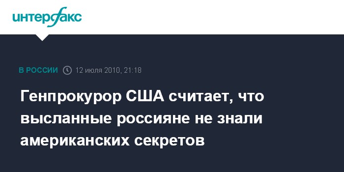 Вашингтон. 12 июля. INTERFAX.RU - Генеральный прокурор США Эрик Холанд считает, что высланные на минувшей неделе из Соединенных Штатов агенты России не смогли раздобыть ни одного американского секрета.