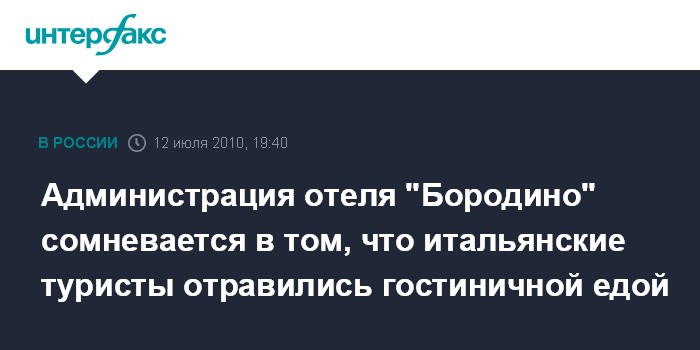 Москва. 13 июля. INTERFAX.RU - Итальянские туристы, госпитализированные на прошлой неделе в Москве, не могли отравиться во время обеда в гостинице "Бородино". Они там не обедали в день, когда у них отмечалось недомогание, сообщила "Интерфаксу" в понедельник менеджер по связям с общественностью отеля Евгения Столярова. Она рассказала, что группа туристов из Вероны в количестве 163 человек прибыла в Москву 8 июля. На следующий день, когда, как предполагается, часть итальянских туристов отравилась, они завтракали в отеле, после чего разделились на несколько групп и отправились в Суздаль, в Сергиев Посад и на обзорные экскурсии по Москве. "В течение дня оставшиеся в Москве группы обедали в городе. Признаки недомогания у итальянцев проявились к вечеру, когда еще до ужина некоторые стали обращаться к персоналу отеля с просьбой принести в номера крепкий чай", - рассказала Столярова.