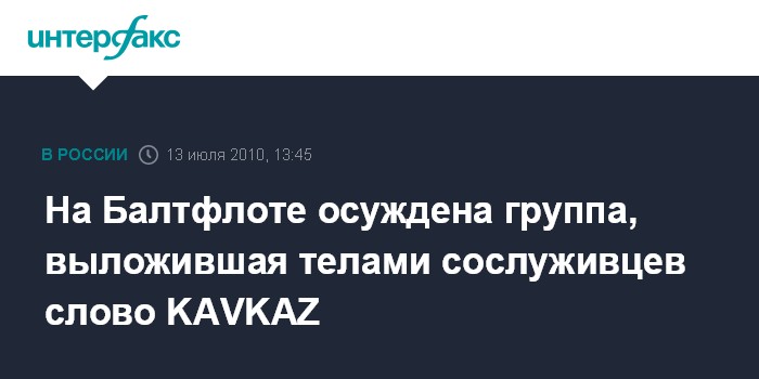 Как сообщила пресс-служба военной прокуратуры БФ, "в августе 2009 г. группа матросов срочной службы под угрозой применения насилия и фактического насилия заставила своих сослуживцев лечь на плацу воинской части таким образом, чтобы их тела составили слово KAVKAZ".