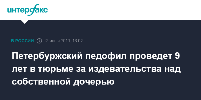 Москва. 13 июля. INTERFAX.RU - Калининский районный суд Петербурга приговорил 35-летнего жителя города к 9 годам лишения свободы за насилие над дочерью, сообщила пресс-служба Следственного управления СКП по Петербургу во вторник. "Обвиняемый, используя беспомощное состояние своей шестилетней дочери, неоднократно совершал в отношении нее насильственные действия сексуального характера, причиняя физическую боль и психические страдания", - говорится в сообщении.