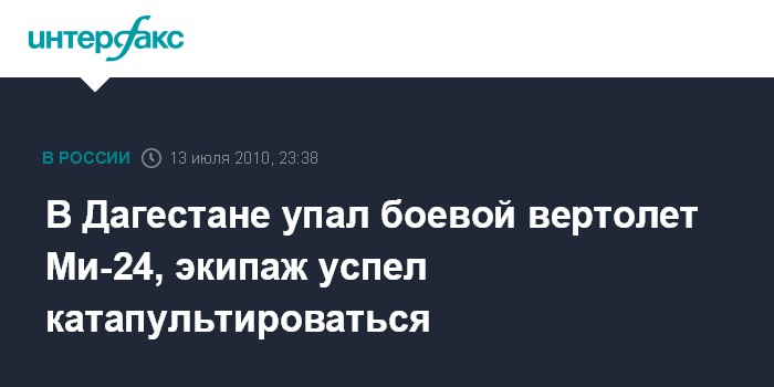 "Около 12:00 мск вторника в ходе выполнения планового полета боевой вертолет Ми-24 зацепил несущим винтом склон горы и совершил вынужденную посадку, упав в ущелье. Экипаж успел катапультироваться", - сообщили агентству "Интерфакс-Юг" в штабе Ботлихского гарнизона.