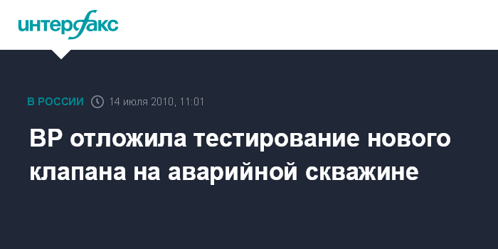 Москва. 14 июля. INTERFAX.RU - BP Plc отложила тестирование нового клапана, установленного в понедельник вечером на аварийной скважине в Мексиканском заливе, чтобы дать ученым больше времени на моделирование ситуации.