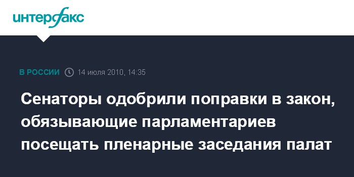 Москва. 14 июля. INTERFAX.RU - Совет Федерации одобрил законопроект, обязывающий депутатов и сенаторов посещать пленарные заседания. Соответствующие поправки внесены в среду в закон "О статусе члена Совета Федерации и статусе депутата Госдумы Федерального собрания РФ".