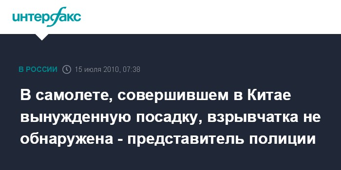 Пекин. 15 июля. ИНТЕРФАКС-КИТАЙ - В совершившем в ночь на четверг вынужденную посадку самолете китайских Южных авиалиний взрывное устройство обнаружено не было, сообщили в четверг местные СМИ со ссылкой на заявление представителя полиции.