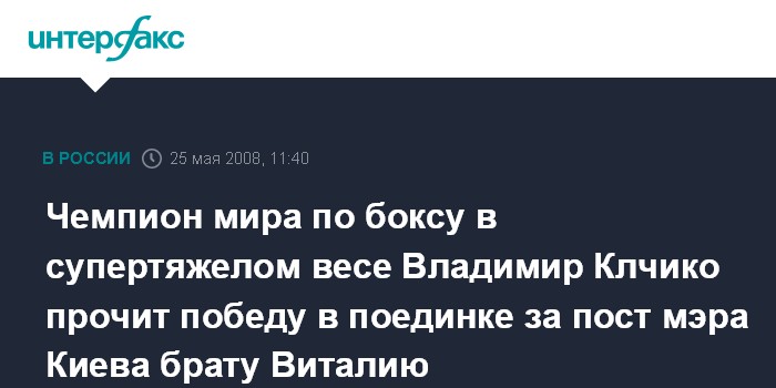 Брат Виталия, боксер Владимир Кличко также уверен в победе брата. "Сегодня поединок на политическом поприще между Виталием Кличко и, я думаю, другим кандидатом - Черновецким (нынешний мэр Киева - ИФ). И я верю, что Виталий Кличко станет мэром", - сказал известный боксер.