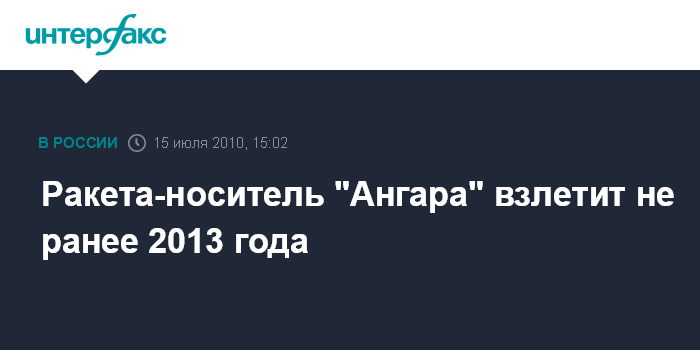 Москва. 15 июля. INTERFAX.RU - Первый запуск ракеты-носителя "Ангара" может состояться не ранее 2013 года, сообщил генеральный директор космического центра имени Хруничева Владимир Нестеров.