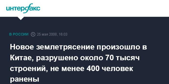 Новое землетрясение произошло в Китае, разрушено около 70 тысяч строений, не менее 400 человек ранены
