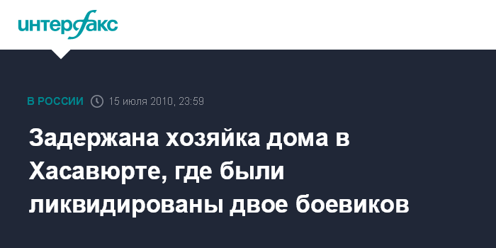 Махачкала. 15 июля. ИНТЕРФАКС-ЮГ – Жительница Хасавюрта 35 лет, в доме которой укрывались убитые ранее в четверг боевики, задержана по подозрению в пособничестве НВФ, сообщили «Интерфаксу» в пресс-службе УФСБ России по Дагестану.