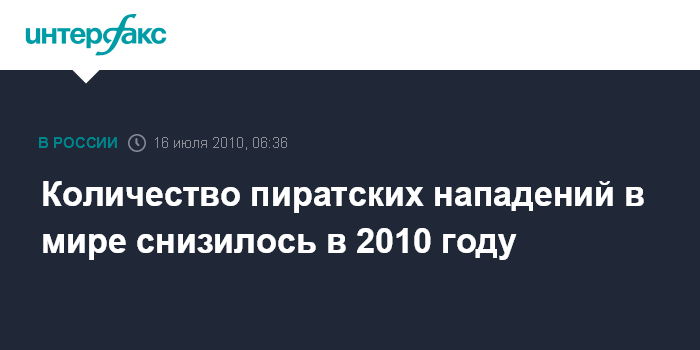 Лондон. 16 июля. ИНТЕРФАКС - В 2010 году снизилось количество совершаемых по всему миру пиратами нападений, сообщает британская телерадиовещательная корпорация Би-би-си со ссылкой на Международное бюро мореплавания.