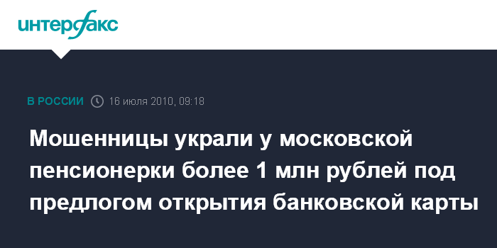Накануне в милицию обратилась жительница Москвы 1927 года рождения с заявлением о хищении у нее большой суммы денег. По словам потерпевшей, в четверг около полудня на Шипиловской улице рядом с домом, где она живет, к ней подошли две женщины и предложили оформить банковскую карту, пообещав, что женщина получит ряд выгод.